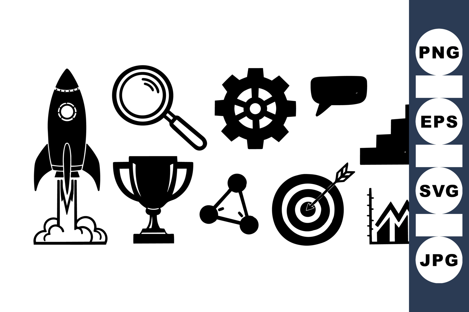 Simple black silhouette icons featuring a rocket launch, magnifying glass, gear, trophy, speech bubble, staircase, target with arrow, and rising graph for business design, modern minimal style.