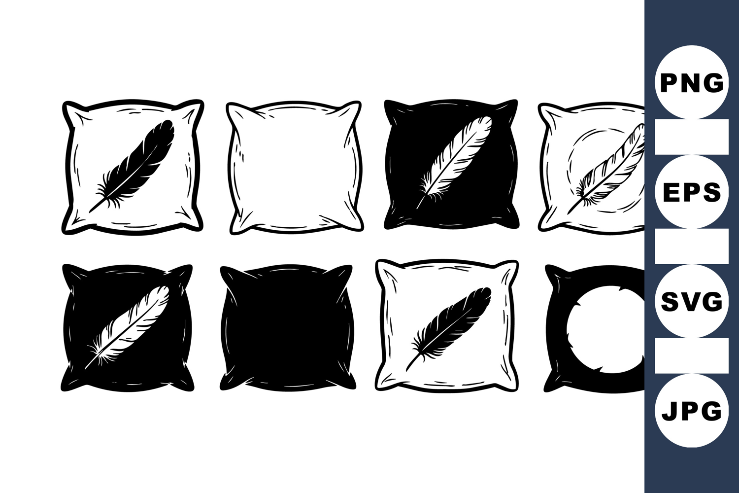 Minimalist black and white pillow icons with feather motifs and clean outlines, suitable for web design, print materials, and textile branding, elegant and clear.