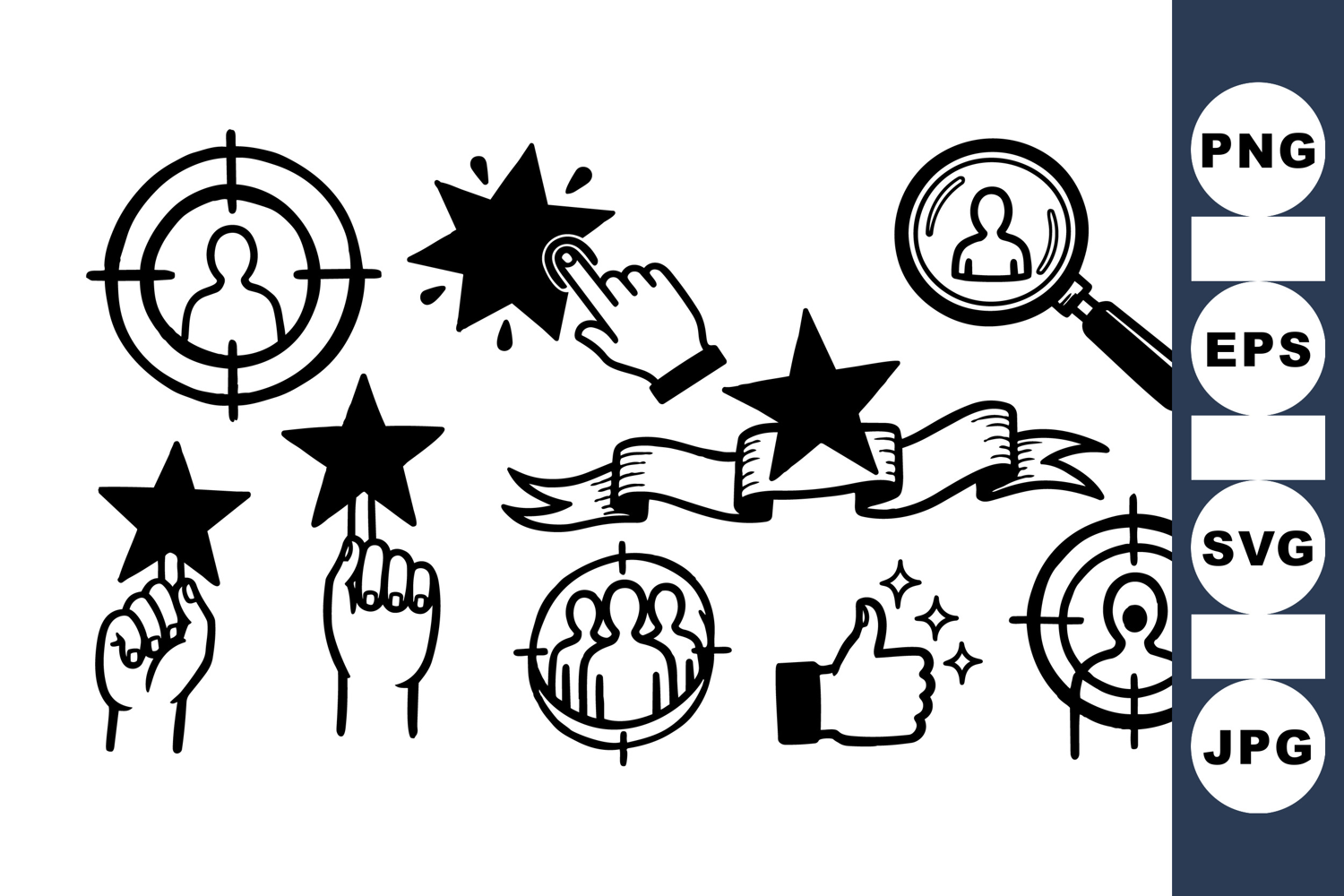 Simple black and white vector icons show hands holding stars, target focus on individuals and groups, magnifying user profiles, and thumbs up for approval in a flat style.