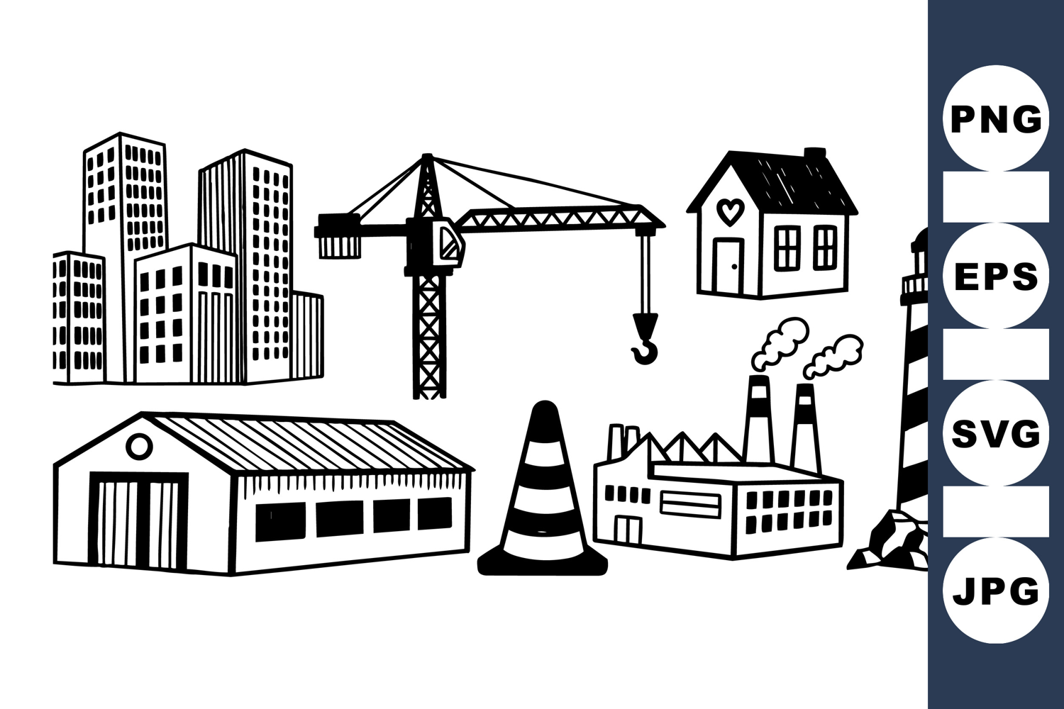 Black And White Icons Construction Crane Clipart Urban Icon Set City Building Vector Industrial Factory Icon Minimalist Building Set Urban Silhouette Kit Lighthouse Vector Pack Vector Cityscape Set Warehouse Clipart Bundle