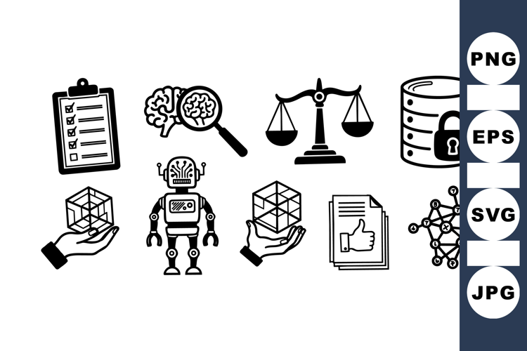 Black and white vector icons show technology concepts like ai robot, brain research, data security, network connections, and legal balance in a simple style.
