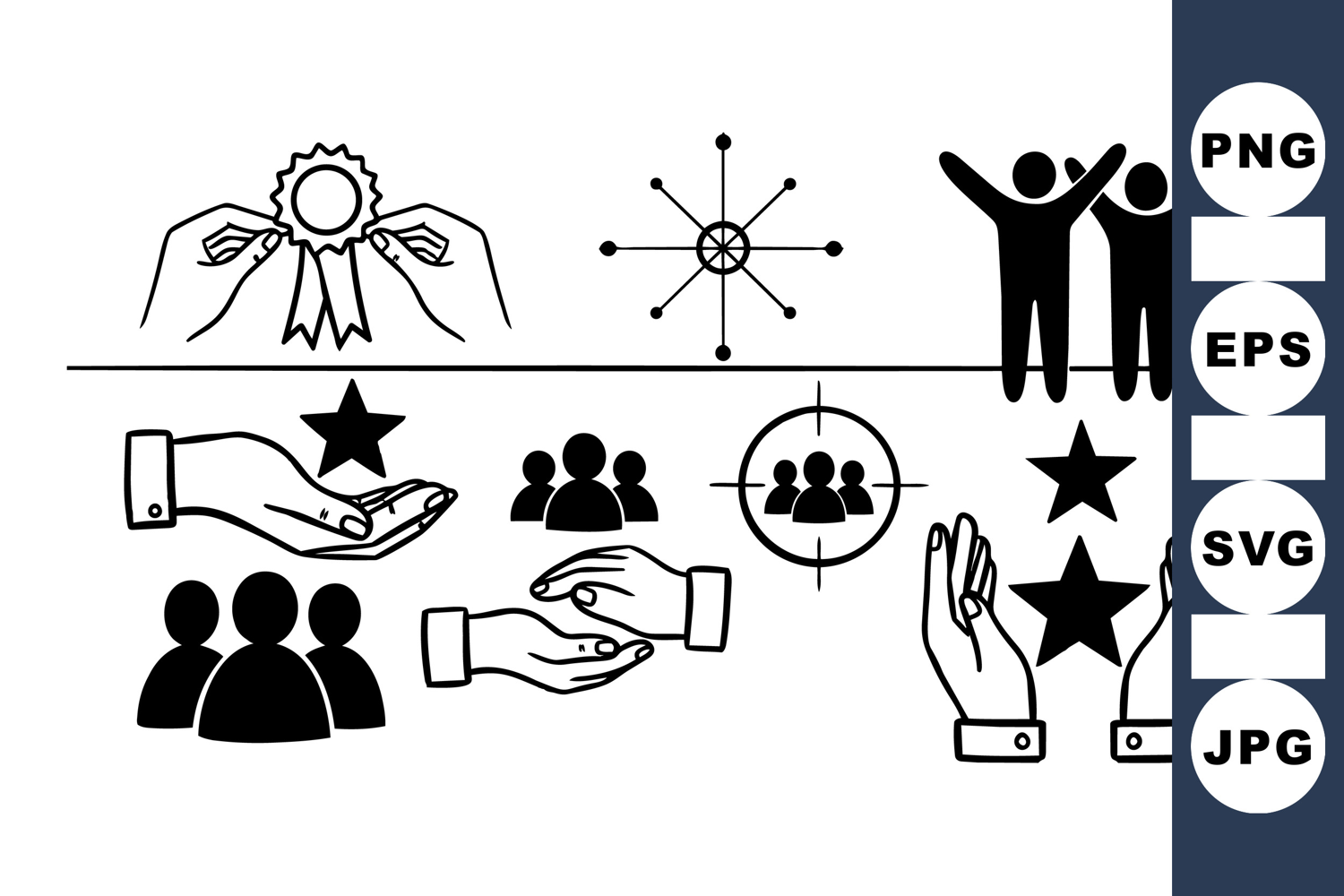 Minimalist vector icons display hands holding stars, group silhouettes, and target symbols illustrating teamwork, recognition, and social connection in clean outline style.