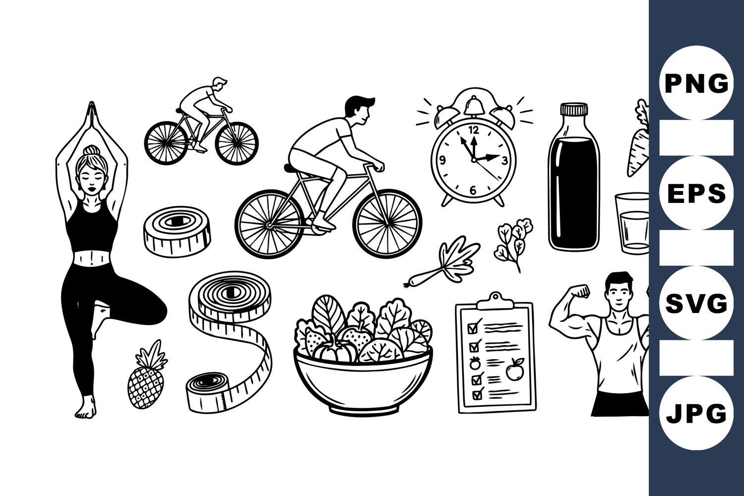 Minimalist black and white vector art featuring yoga pose, cycling figures, measuring tape, alarm clock, salad bowl, juice bottle, and muscular man flexing.
