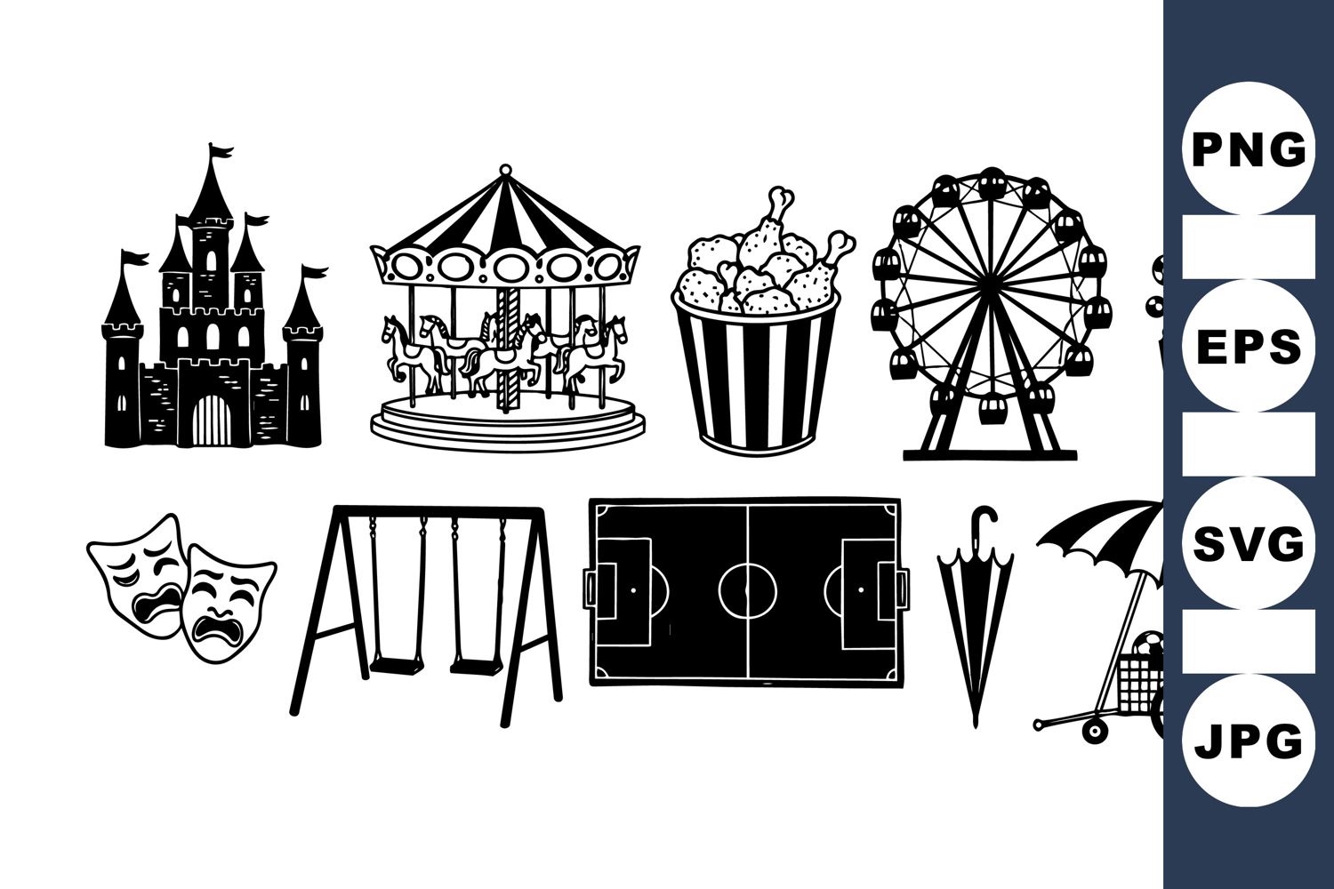 A collection of black and white vector icons shows various amusement park and playground items including castle, carousel horses, sports, and theater symbols in simple flat design style.