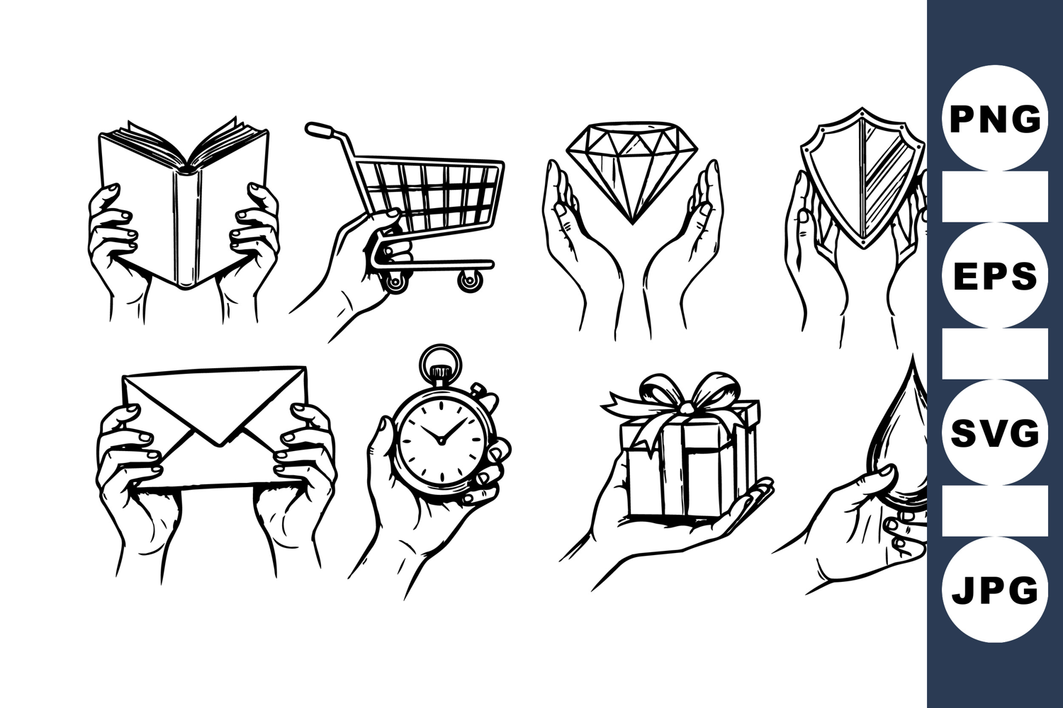 A collection of monochrome hand drawn vector icons displaying various objects held by hands including a book, cart, diamond, shield, envelope, stopwatch, gift, and drop with sketch style.