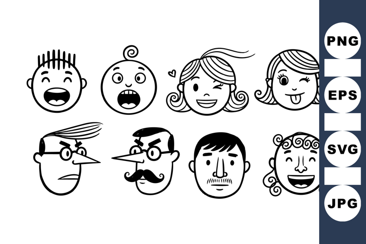 Hand Drawn Faces Black And White Icons Funny Expression Set Cartoon Face Icons Vector Face Bundle Laughing Smile Pack Surprised Baby Faces Man And Woman Faces Comic Style Faces Outline Face Collection