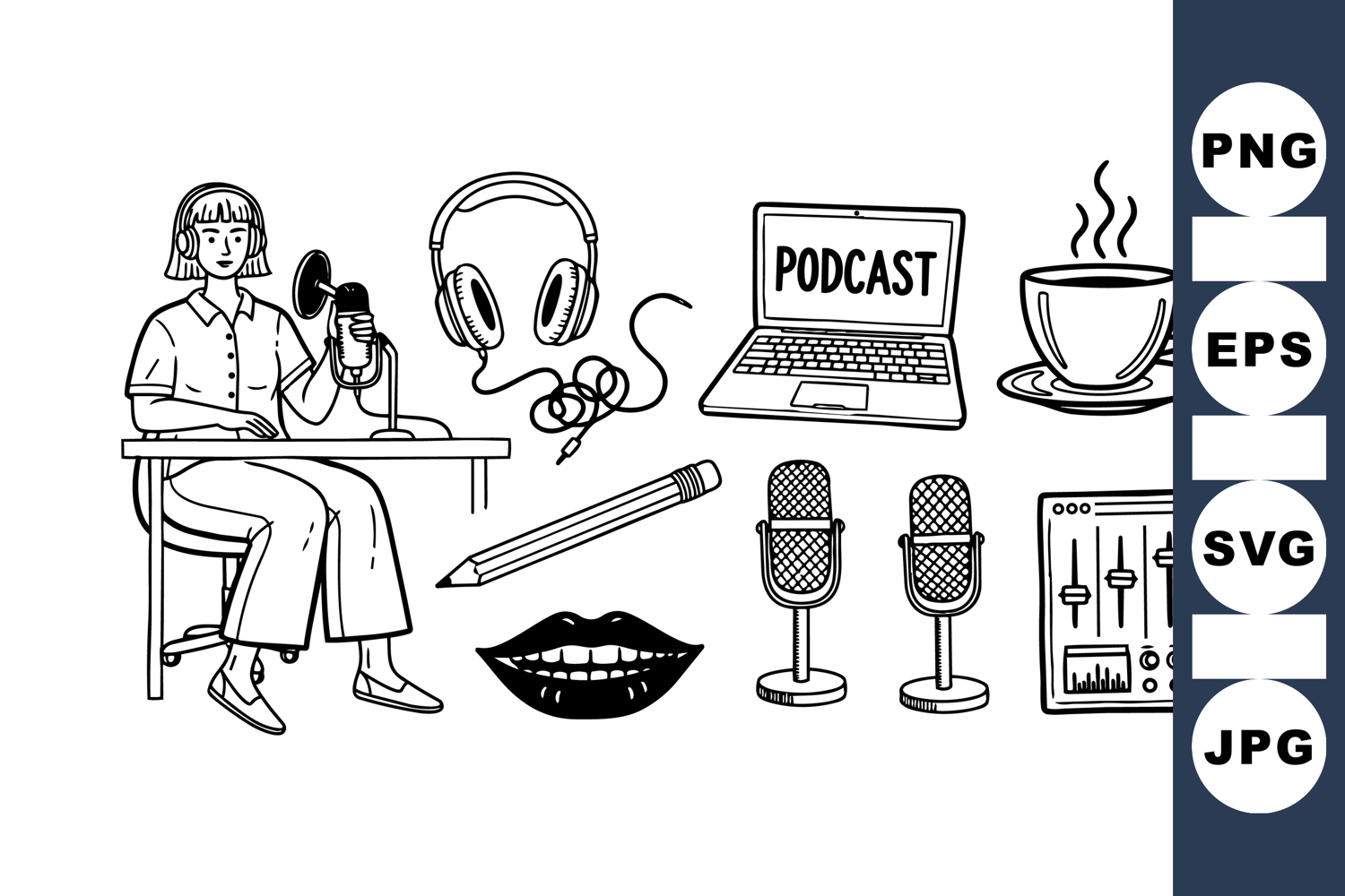 Hand drawn black and white vector illustration showing a female podcast host setting up microphone and headphones with laptop marked podcast and coffee, pencil, sound mixer included, peaceful composition.