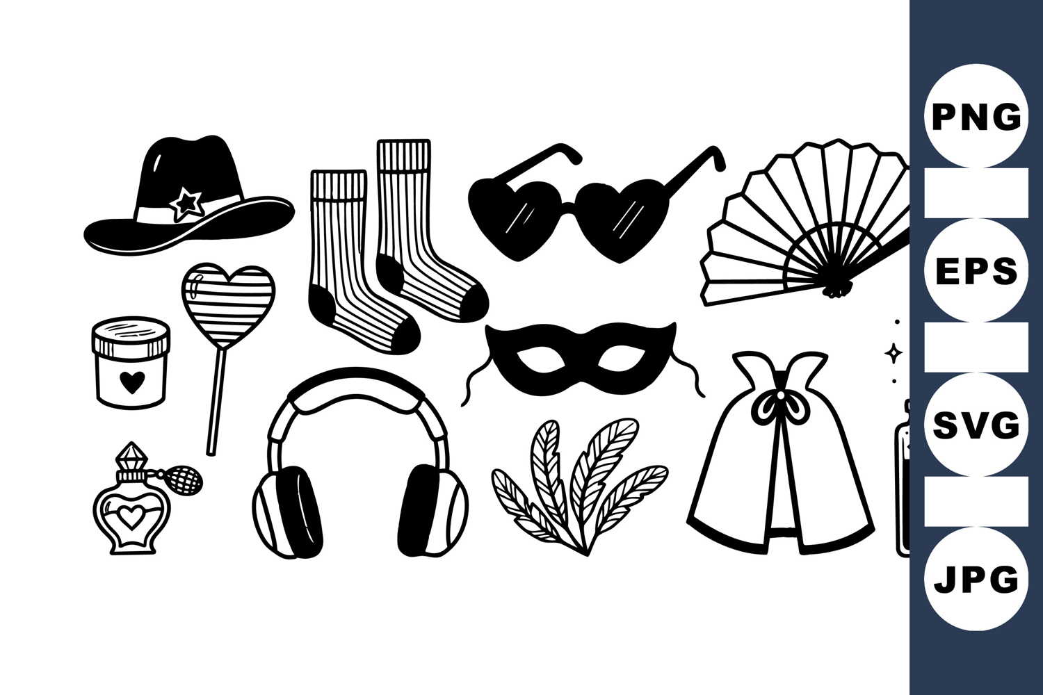 Black And White Clipart Valentine Day Clipart Retro Style Svg Fun Holiday Illustrations Fashion Accessory Set Party Decoration Bundle Crafting Svg Collection Vintage Party Accessories Hand Drawn Costume Set Costume Accessory Graphics