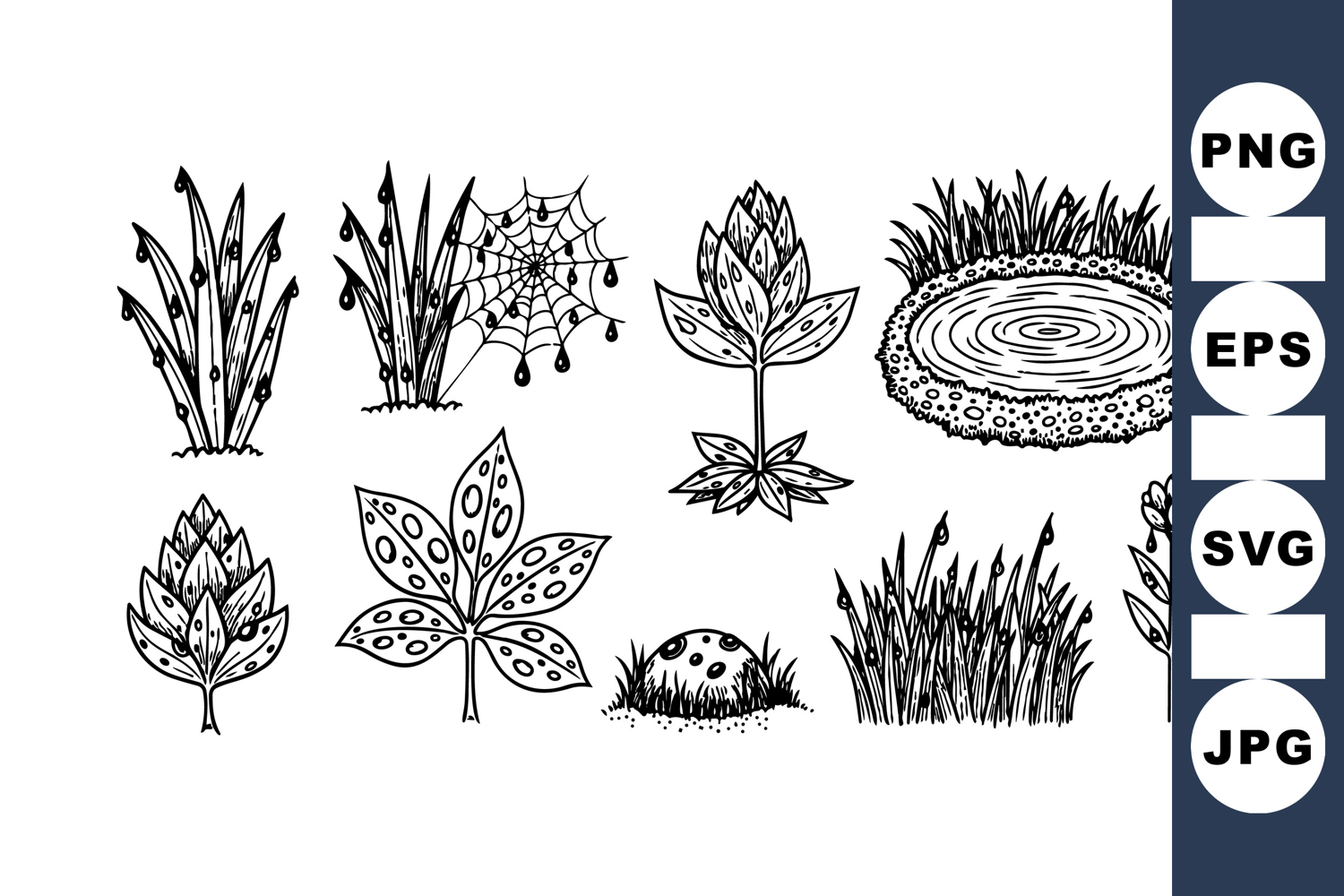 A set of hand drawn black and white botanical elements including grass, flowers, spider web with dew drops, and a pond, illustrating nature and ecology themes in vector art style.