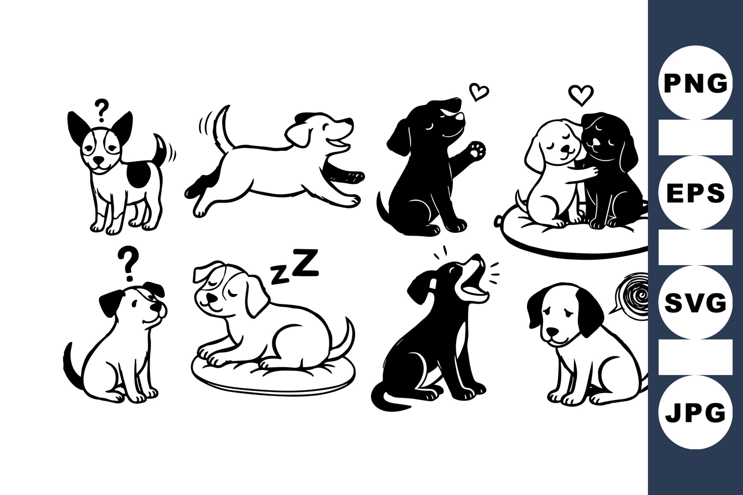 Black and white vector art shows playful and affectionate dogs in different postures and moods, using flat design for friendly, simple character depiction.
