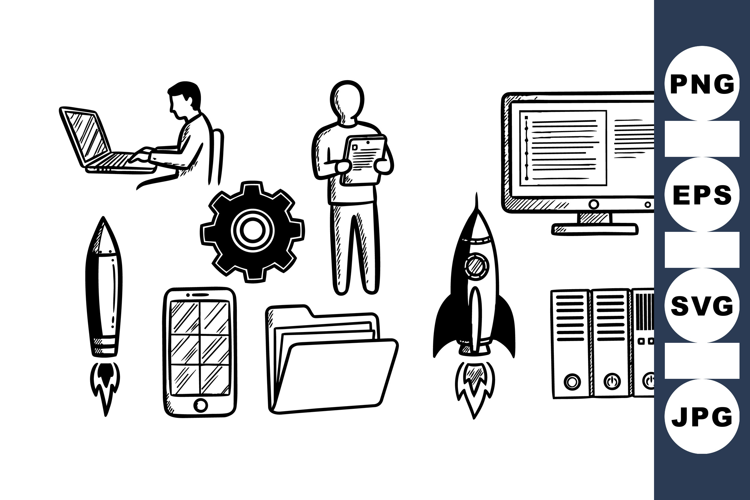 Set of hand sketch style office and technology icons featuring rockets, laptop user, smartphone, folder, gear, and computer monitor with detailed line art design.