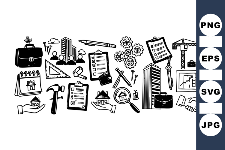 Hand Drawn Icons Business Icon Set Office Supplies Clipart Real Estate Graphics Project Management Icons Construction Icons Kit Urban Development Set Corporate Work Bundle Architecture Design Pack Team Partnership Clipart