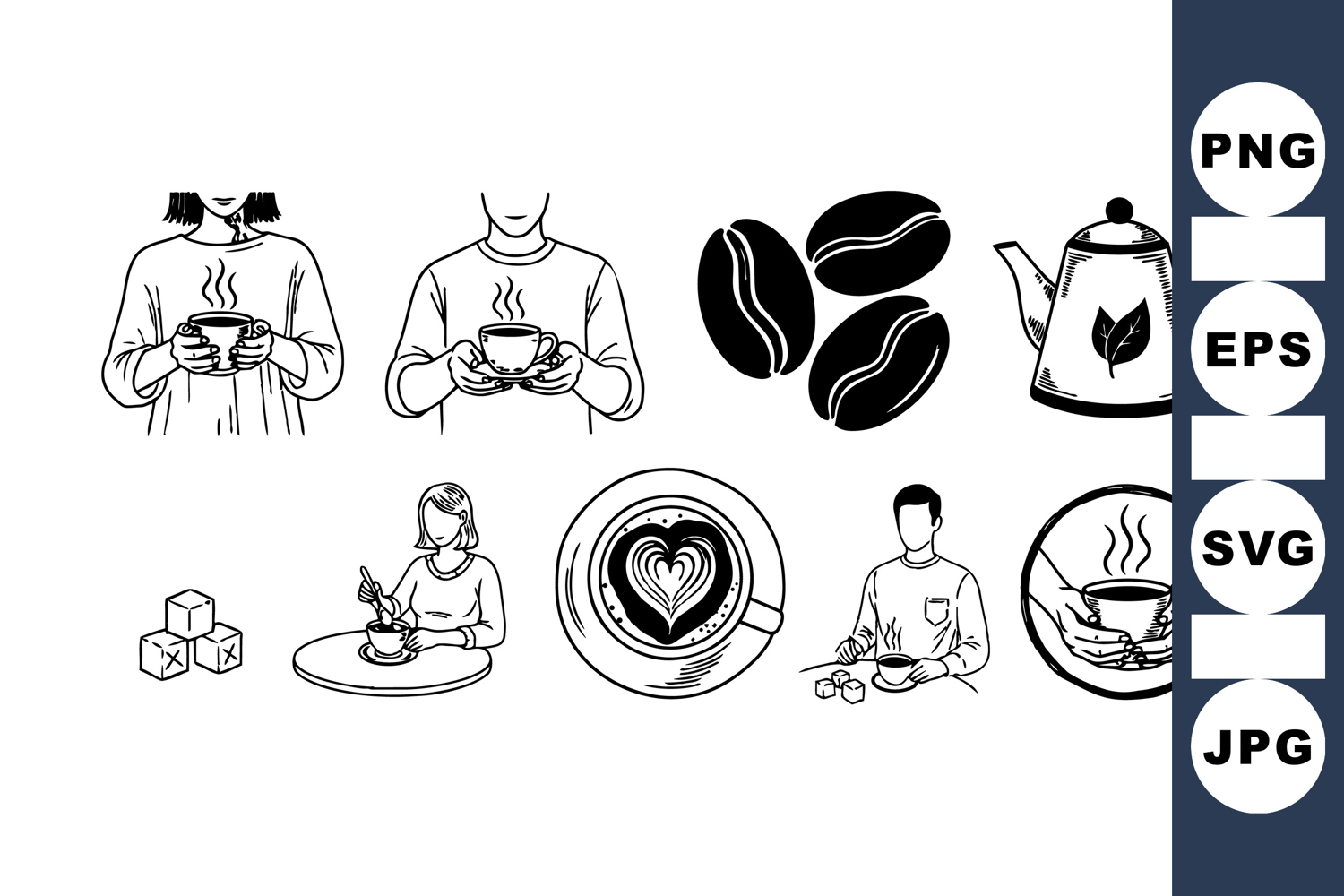 Collection of black and white coffee vector illustrations shows people enjoying hot coffee cups, coffee beans, teapot, and sugar cubes in hand drawn style, peaceful and simple.