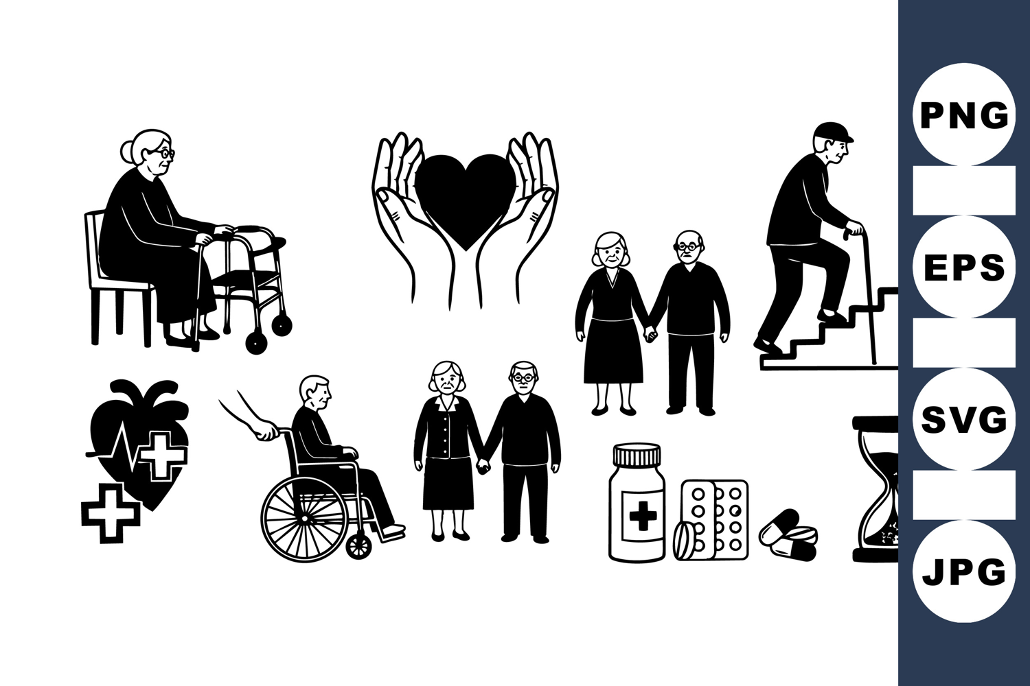 Illustrated health and elderly care vector symbols include couple holding hands, person in wheelchair, pills, heart icons, and man climbing stairs with cane.