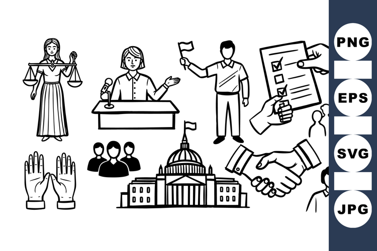 Black and white line art vector showing political and legal symbols including judge, debate, voting, handshake, government building, and community group icons with clean minimalist style.
