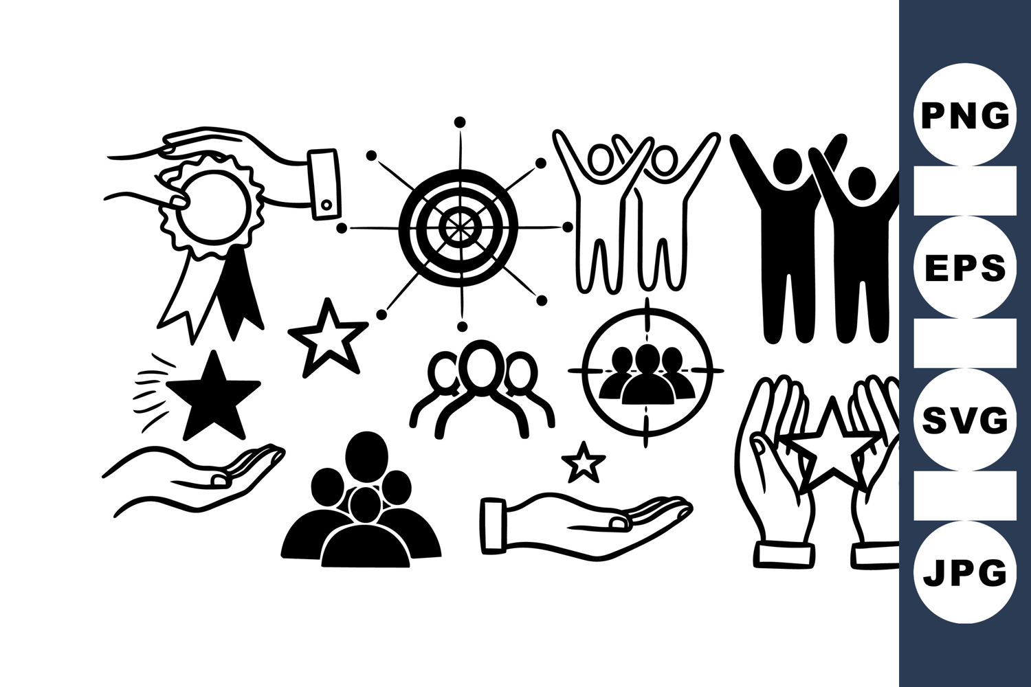 Black and white minimalist vector icon set displays various teamwork, target, celebration, and excellence symbols with hands and star elements for business or social use.