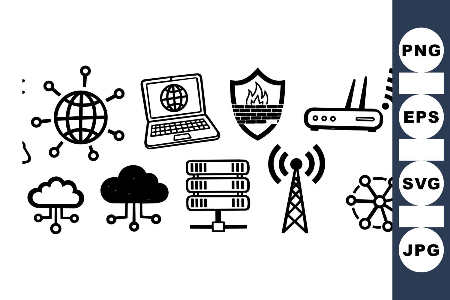 A collection of black and white vector icons illustrating laptop with globe, firewall protection, cloud computing, server stacks, wireless router, and signal tower symbols in flat design style ideal for tech branding and web use