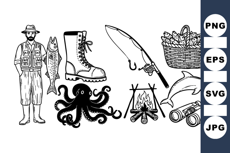 A detailed black and white vector set featuring a fisherman holding a fish, fishing gear, sea creatures, and a campfire in classic line art style, ideal for outdoors or fishing themed designs.