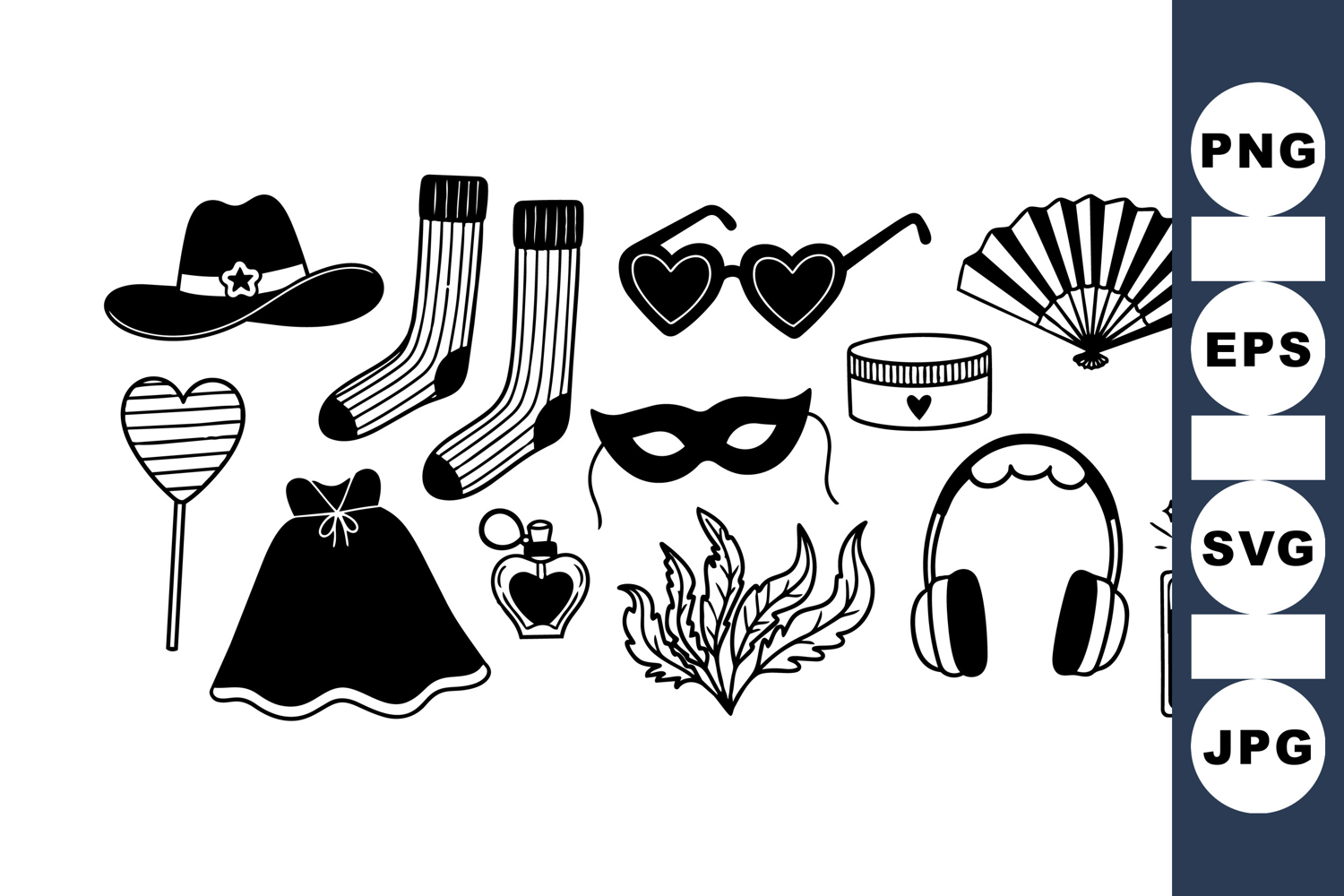 A set of black silhouette costume accessories includes heart shaped sunglasses, striped socks, feather decoration, headphone, mask, fan, and cowboy hat for creative design and festive use.