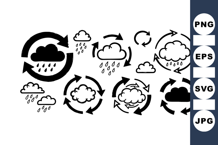 A vector collection of black and white rain cloud icons with circular arrows illustrating the water cycle and weather precipitation in a simple flat style