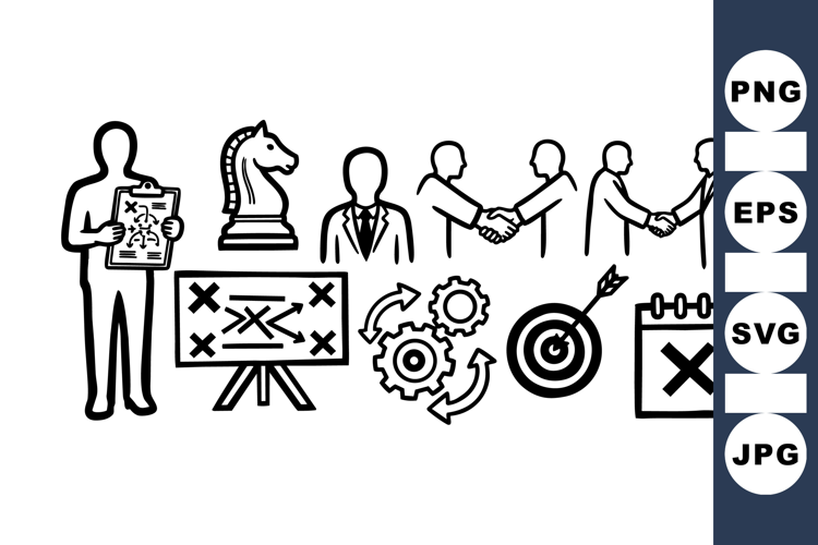 Collection of hand drawn business strategy icons including handshake, chess knight, gears, target, and calendar symbolizing planning and collaboration.