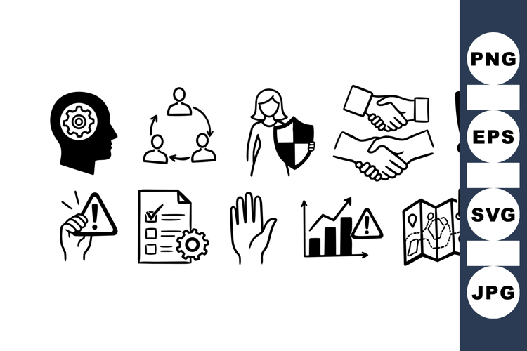 Hand drawn black and white business risk management icons showing partnership, protection, warning, evaluation, and strategy in a simple style suitable for corporate presentations and reports.