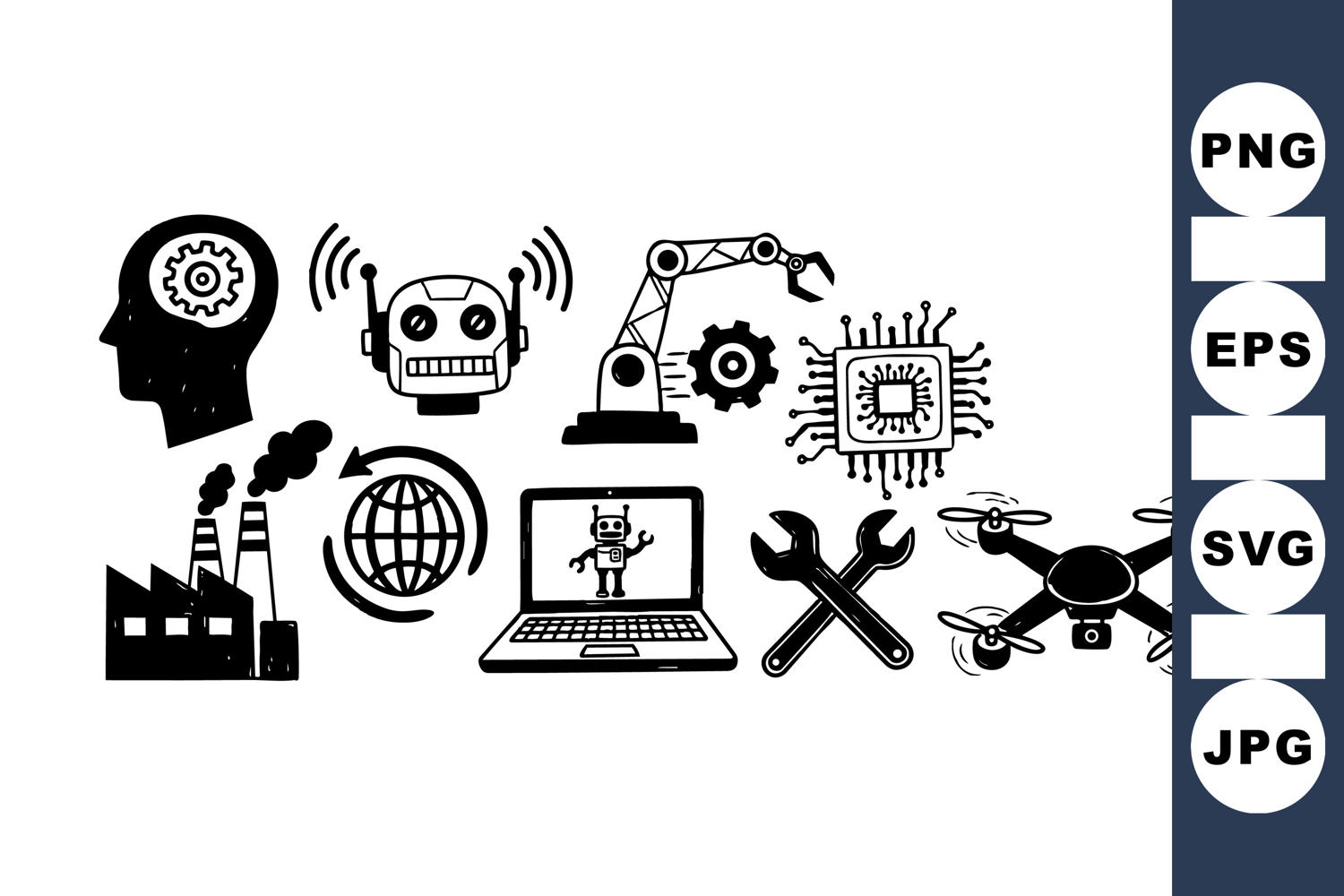 A collection of black and white vector icons illustrating robotics, ai, factory automation, drones, microchips, and global communication in a minimalist style, ideal for tech presentations or educational materials.