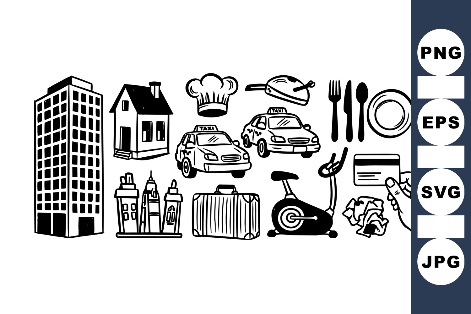 Credit Card Vector Exercise Bike Graphic Chef Hat Illustration Urban Lifestyle Icons Travel Suitcase Icon Kitchen Utensil Set City Building Clipart Hand Drawn Taxi Restaurant Dining Clipart Urban City Skyline