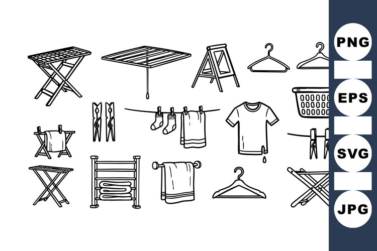 A minimalist line art set shows various drying racks, laundry hangers, clothespins, and garments in black outline on white, suitable for cleaning or home care themes.