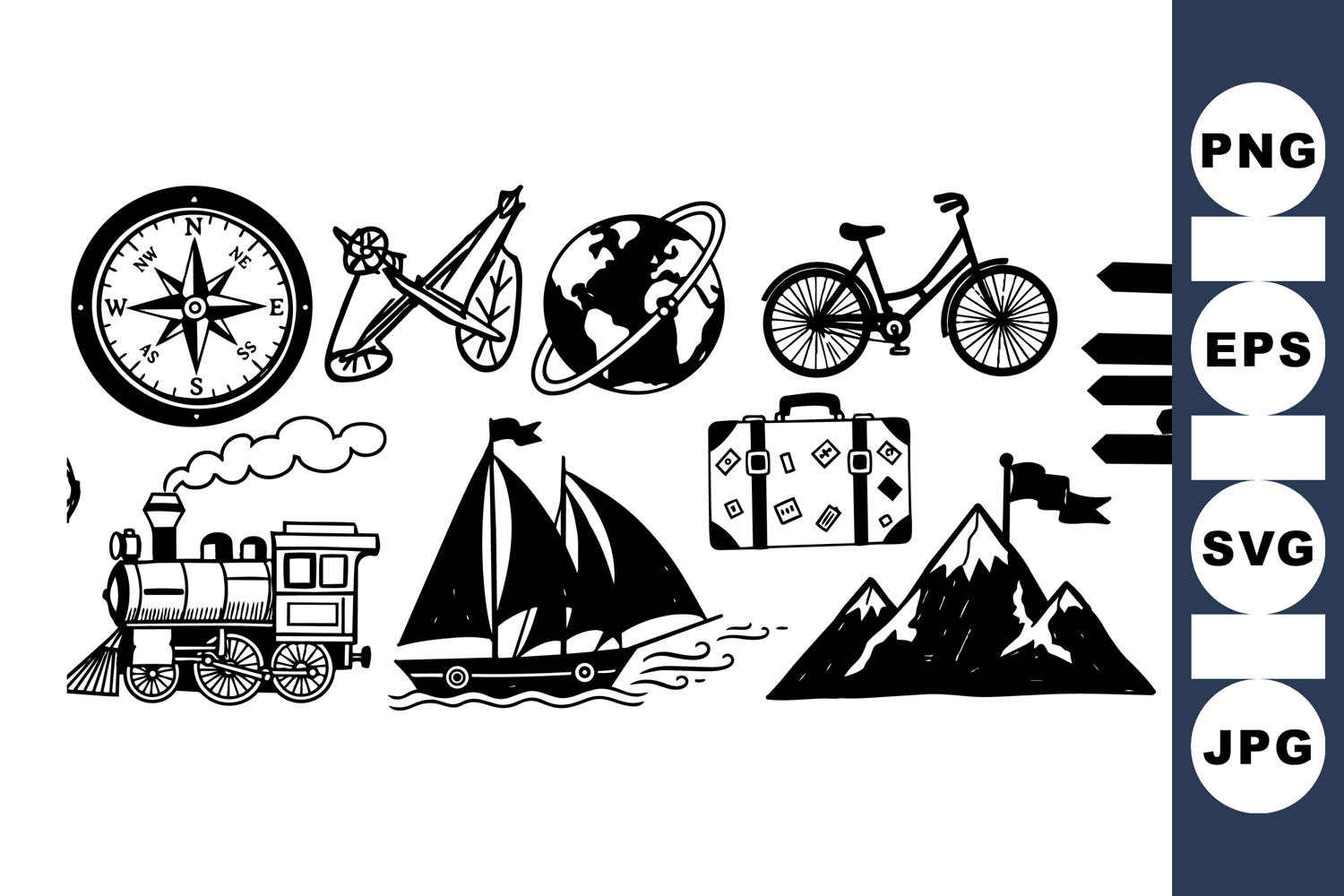 A collection of black travel themed icons including a compass, vintage train, bicycle, suitcase, sailboat, mountains, and directional signpost in classic silhouette style.