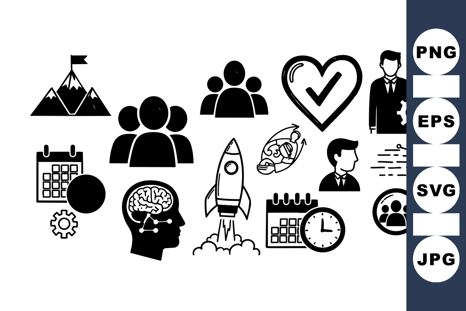 Collection of black and white vector icons illustrating business growth, strategy, teamwork, leadership, calendar management, brain analytics, and project launch concepts.
