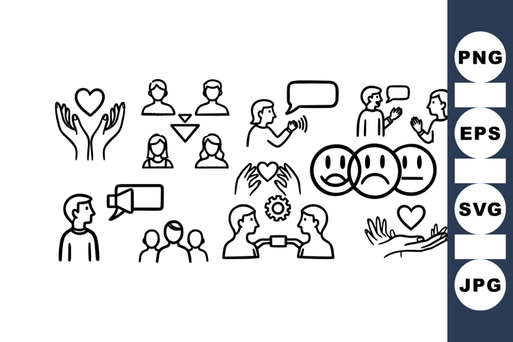 Collection of minimalist line art icons showing different social communication styles, emotional expression, group relations, and empathetic gestures in modern vector style