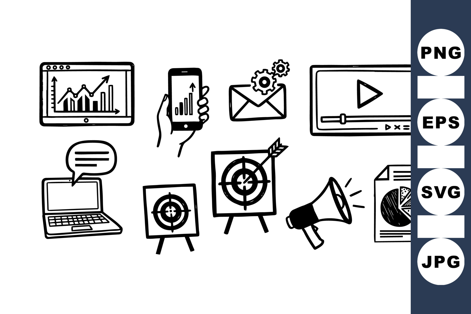 Simple black line art icons depict growth charts on devices, email, video play, targets, megaphone, and report visualization in clean vector style