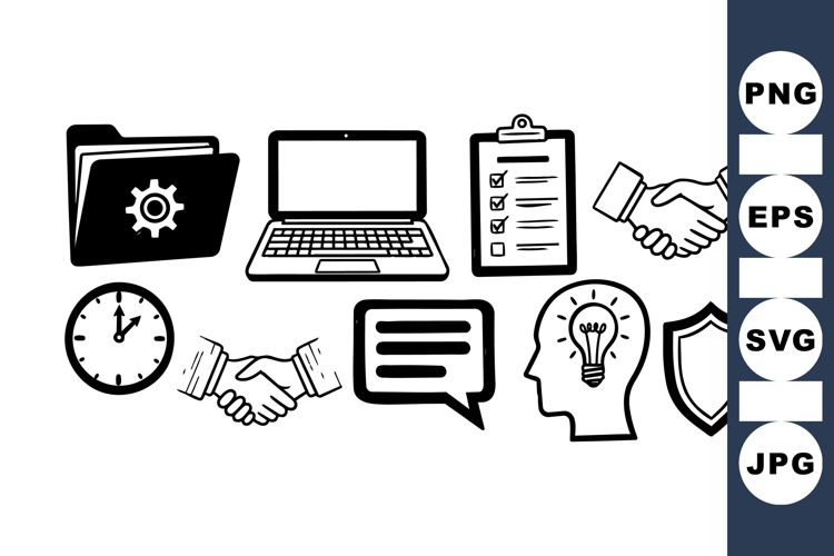 Simple black and white line art business icons include a laptop, checklist clipboard, handshake, clock, chat bubble, a gear folder, shield, and an idea lightbulb in head silhouette, presenting a clean and minimal style great for corporate and organizational designs, calm and professional.