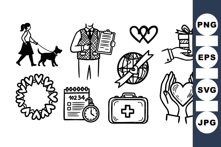 Hand Drawn Icons Gift Box Graphics Helping Hands Clipart Medical Aid Illustrations Charity Clipart Set Nonprofit Design Bundle Volunteer Icon Pack Donation Graphic Set Heart Care Designs Dog Walking Icons