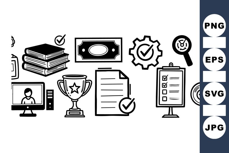 Collection of simple black and white vector icons including books, money, trophy, checklist, computer, magnifying glass, document, and gears for versatile use.