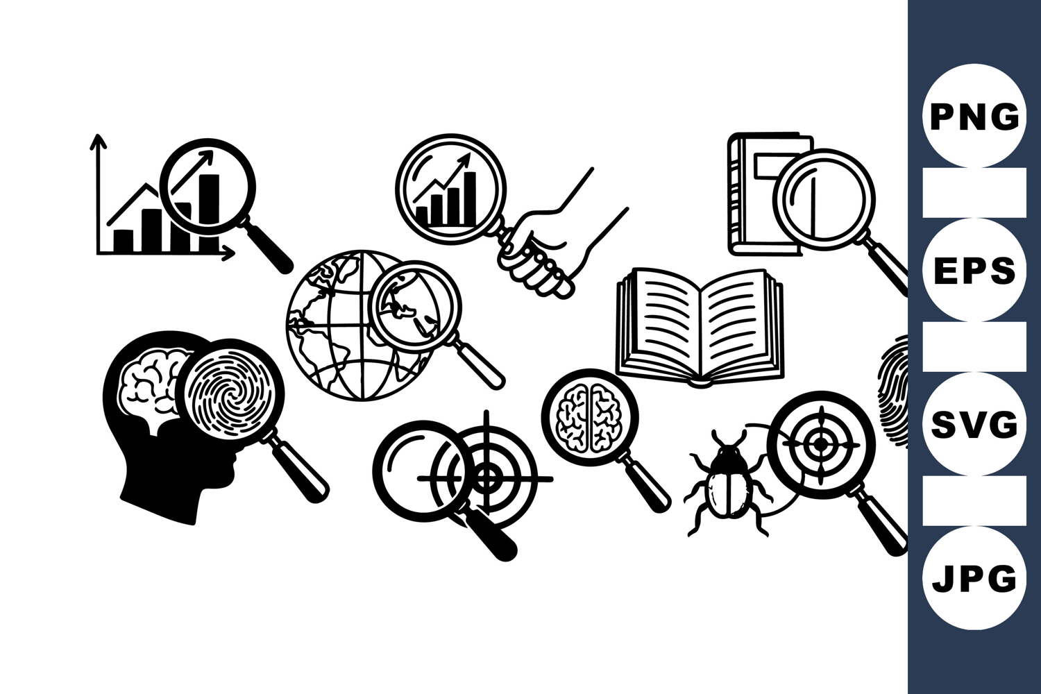 Magnifying Glass Icon Target Focus Vector Business Growth Symbols Data Analysis Vector Scientific Research Icons Brain Study Illustration Fingerprint Scan Graphic Bug Inspection Clipart Educational Project Icons Global Study Illustration