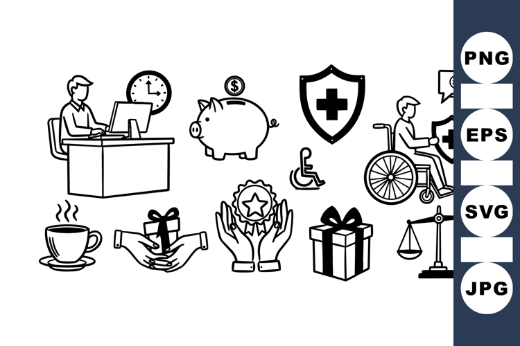 Set of black outline vector icons showing business, finance, healthcare, disability rights, rewards, gifts, and justice concepts in minimal style and clear composition