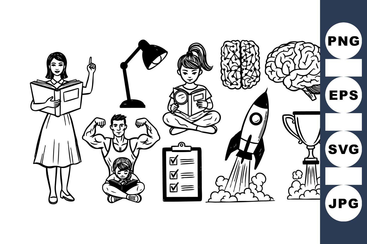 Black and white line art vector depicts education, strength, knowledge, and achievement symbols including a teacher, muscle man, children reading, brain diagrams, rocket, and trophy.