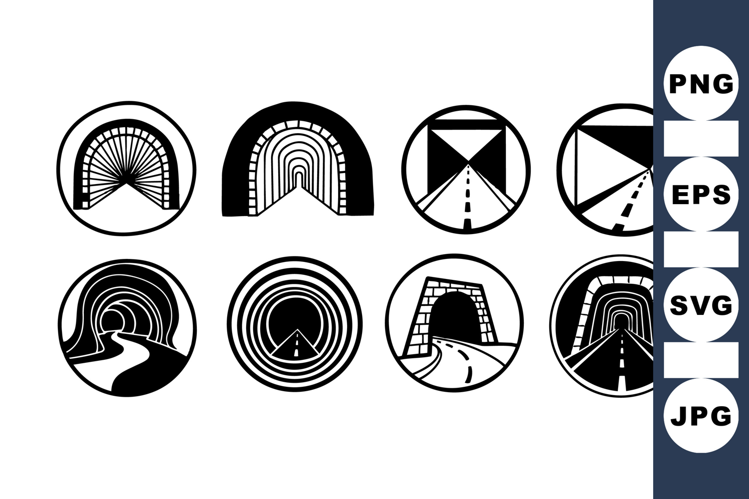 A black and white icon set shows multiple geometric tunnel and road designs with different perspectives and circular frames, simple and minimalistic style.