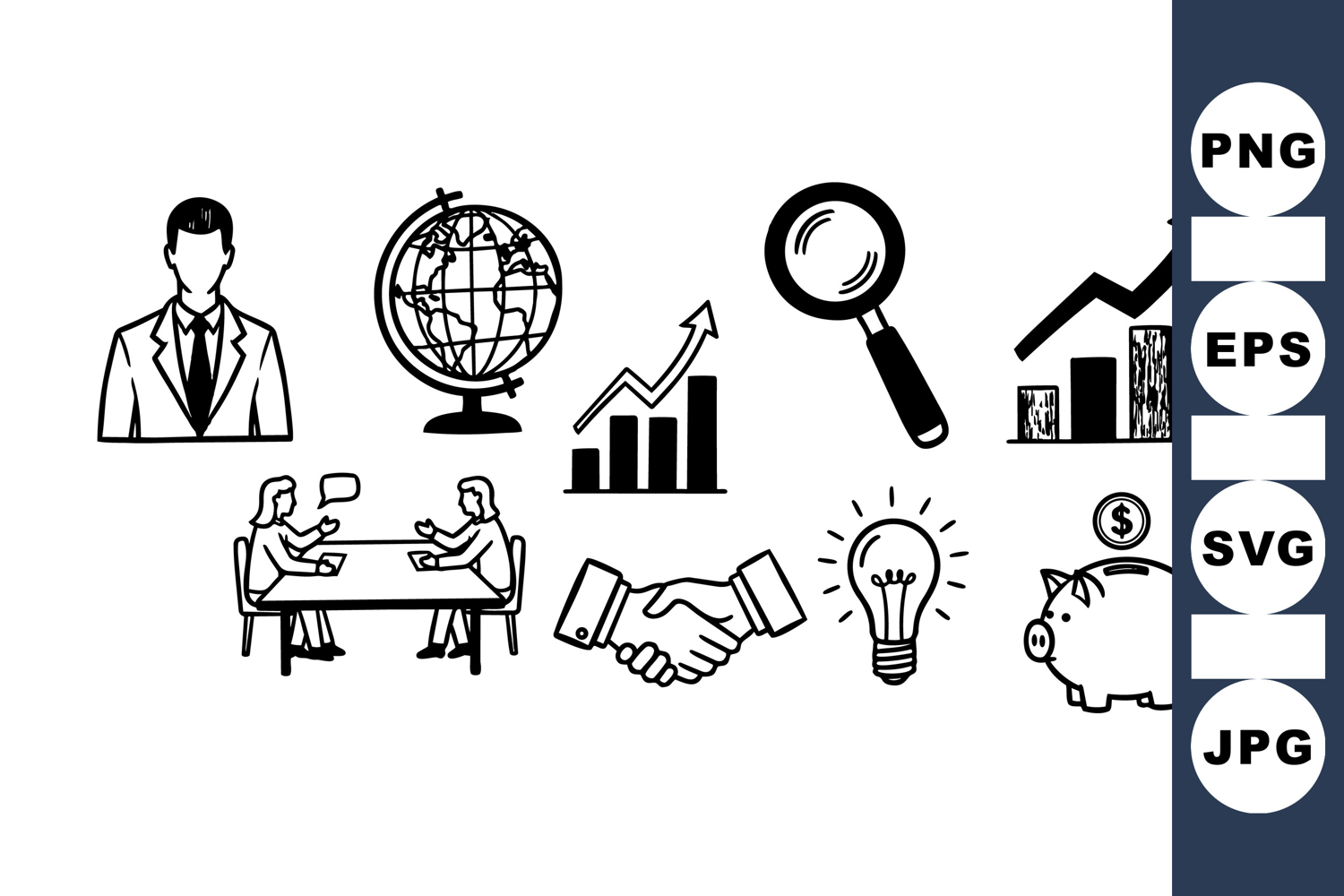 Hand Drawn Icons Business Icon Set Magnifying Glass Icon Growth Chart Graphics Corporate Meeting Icons Business Handshake Clipart Strategy Vector Pack Financial Graph Symbols Investment Piggybank Vector Light Bulb Idea Graphic