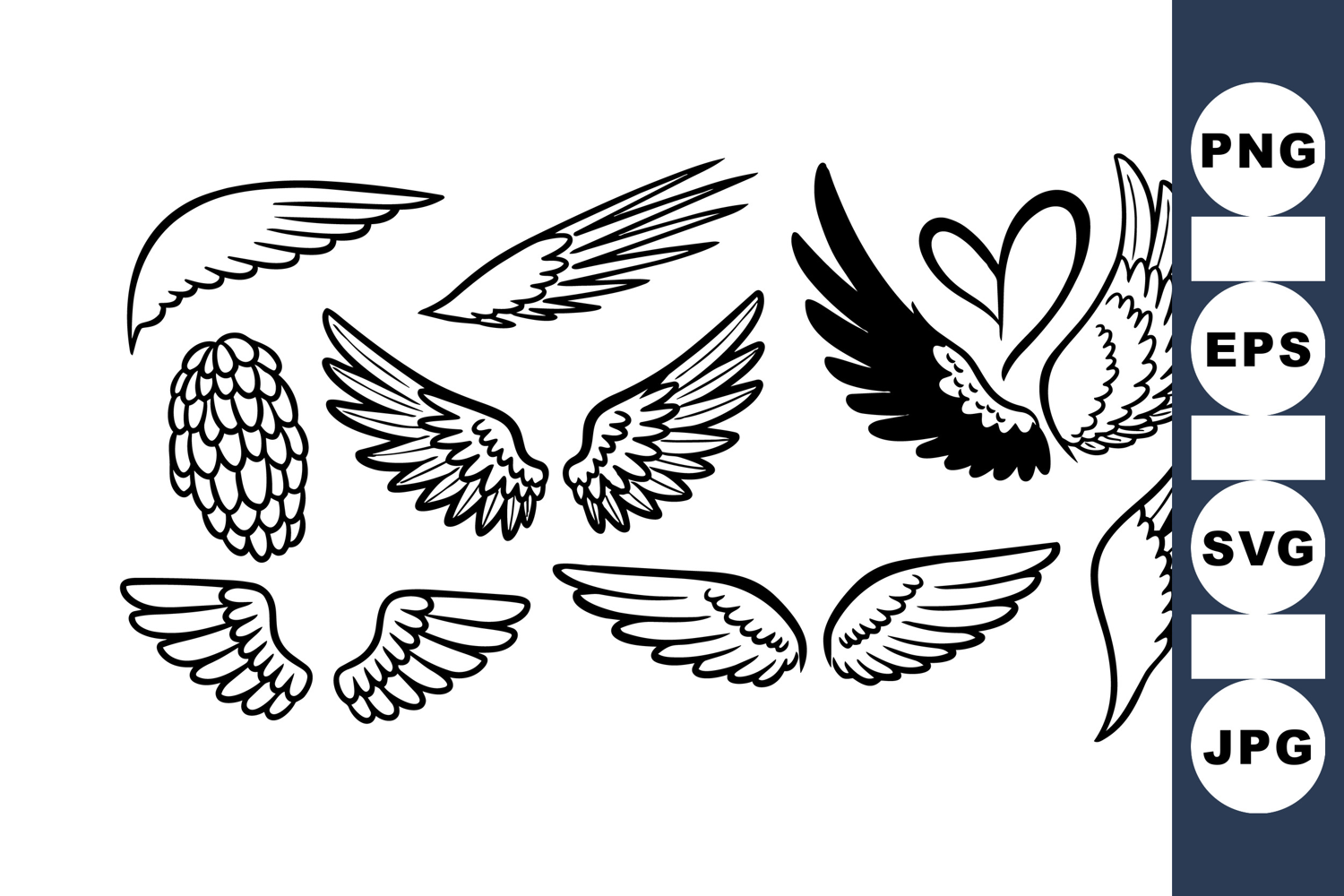 A collection of hand drawn wing illustrations with different feather styles including a heart shaped wing design, rendered in black outline vector art, peaceful and versatile.