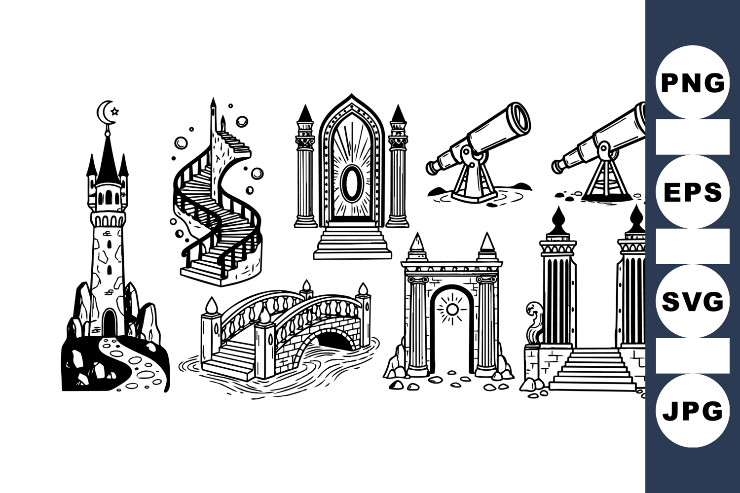 Collection of black and white vector fantasy architectures with towers, spiral stairs, telescopes, stone bridges, and portals in detailed line art, suitable for fantasy themes and storytelling, mysterious mood