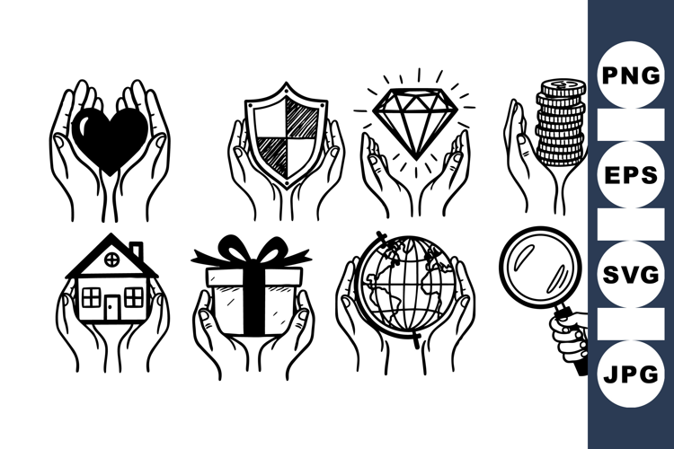Set of hand drawn vector icons showing hands holding symbolic objects like heart, shield, diamond, coins, house, gift, globe, and magnifying glass in monochrome style.