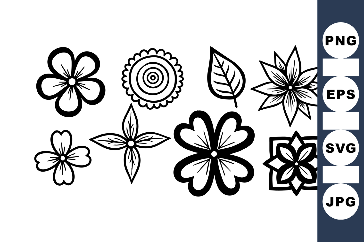 A collection of black and white flower and leaf line art designs with different petal styles, arranged simply for use in decoration and pattern creation, elegant and crisp.