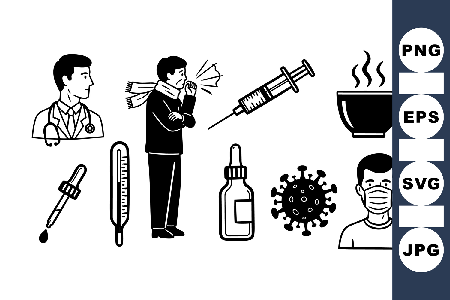 Medical Vector Icons Healthcare Design Set Medical Syringe Icons Doctor Silhouette Pack Virus Clipart Collection Flu Symptom Illustration Thermometer Graphic Set Health Treatment Vectors Medical Mask Designs Infection Symbol Bundle