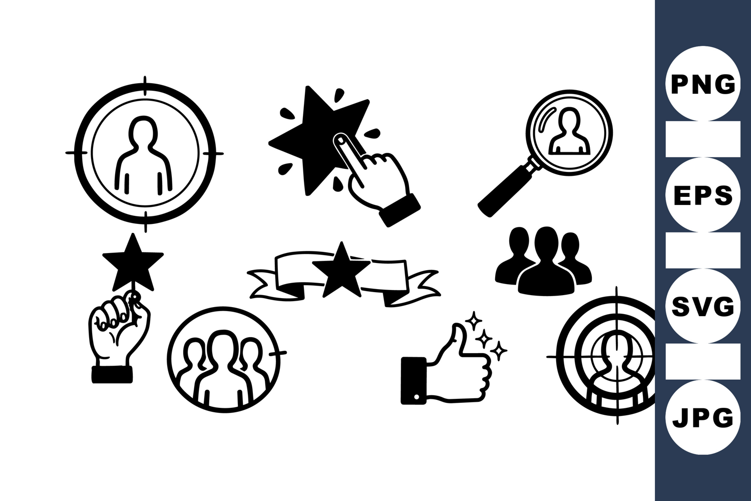 Set of black and white minimalist vector icons including user target circles, star ratings, thumbs up, and crowd group silhouettes for digital interfaces and presentations.