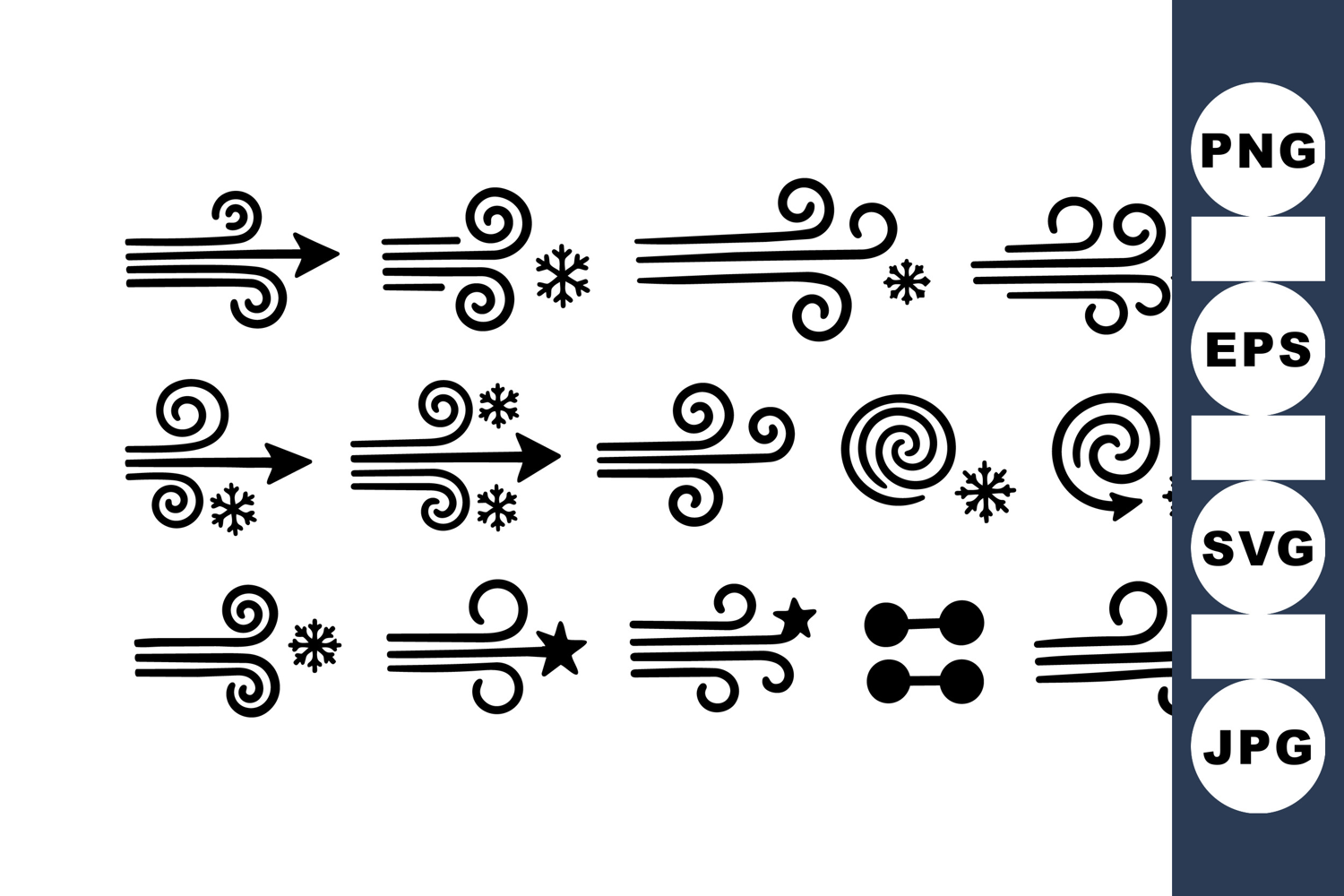 A collection of black wind icons with swirling lines, stars, and snowflakes in flat design vector style, depicting various air movements and weather elements.