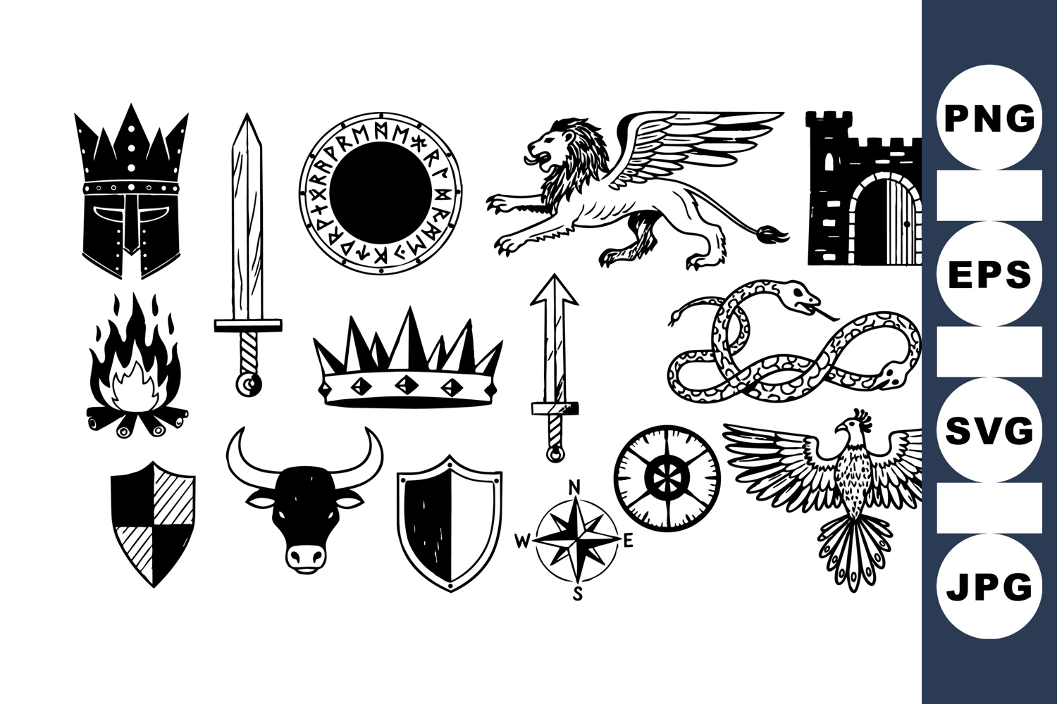 A detailed black and white medieval inspired vector art collection showing various symbols like swords, shields, animals, and a castle in classic line art style, vintage and bold.