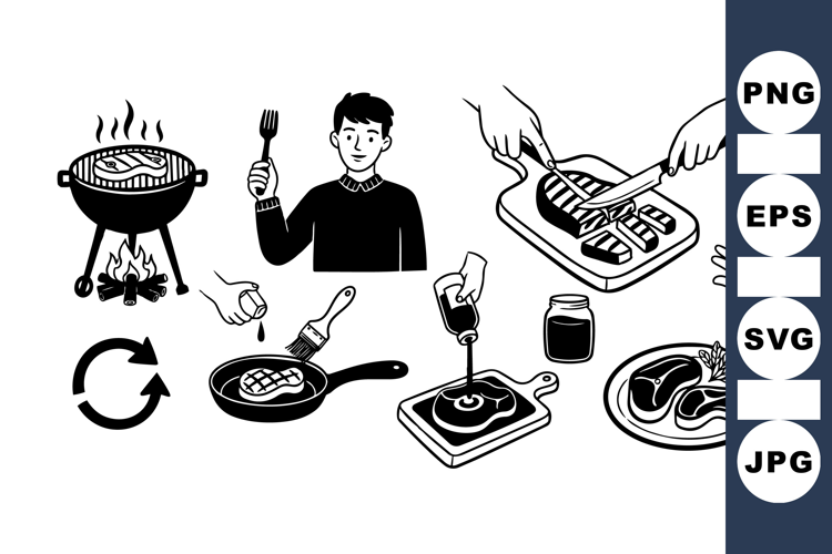 Black and white vector illustrations depict cooking steak on grill and pan, seasoning, slicing meat, and a person ready to eat, rendered in flat style.